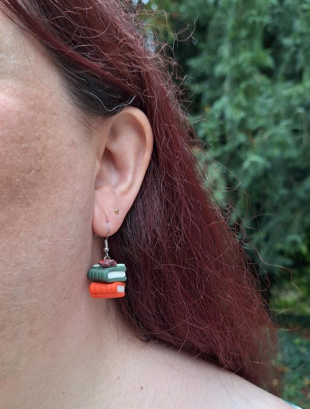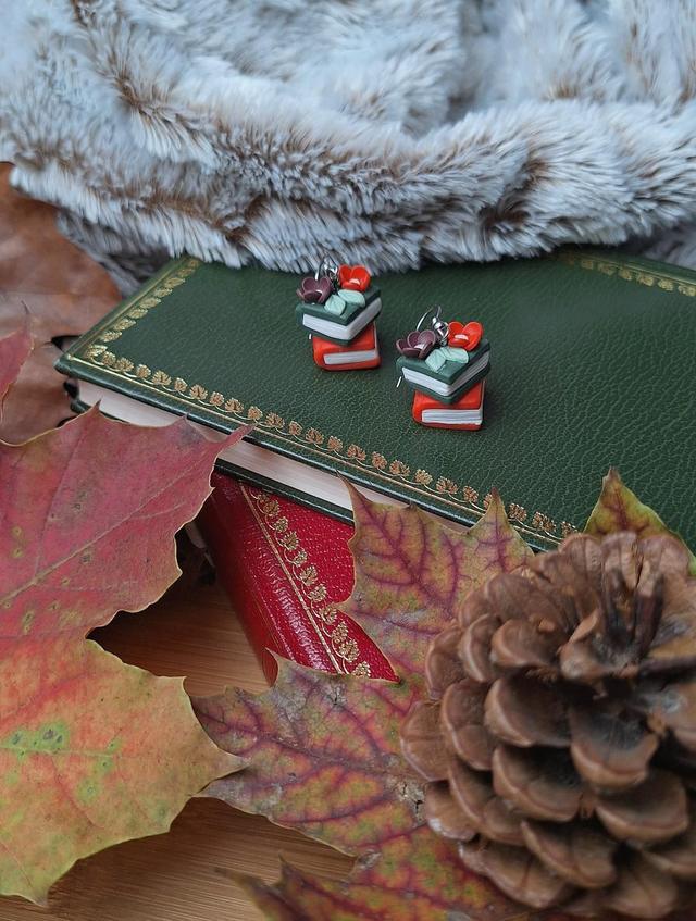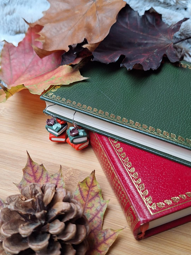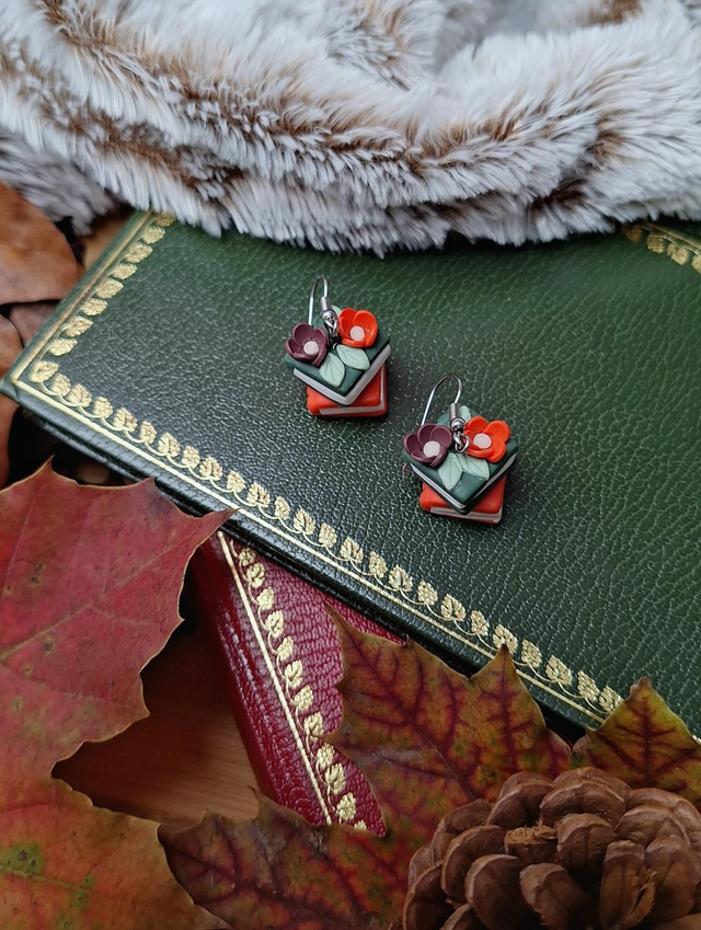 Quand les journées raccourcissent et que le froid se fait ressentir, rien ne vaut un bon livre, un plaid tout doux et une tasse fumante… Ces boucles d’oreilles capturent exactement ce moment cocooning : deux petits livres empilés, surmontés de délicates fleurs aux teintes automnales.