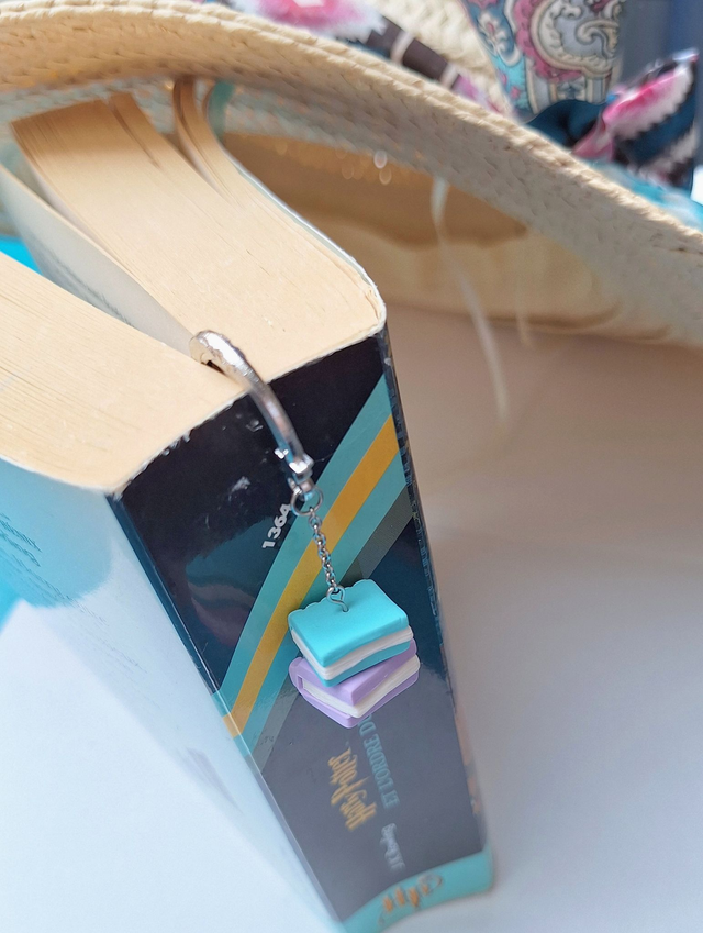 Ce marque-page bijou est orné d’un duo de petits livres faits main en pâte polymère, suspendus à une fine chaînette. Chaque pièce est unique, façonnée avec soin et pensée pour embellir tes moments de lecture.