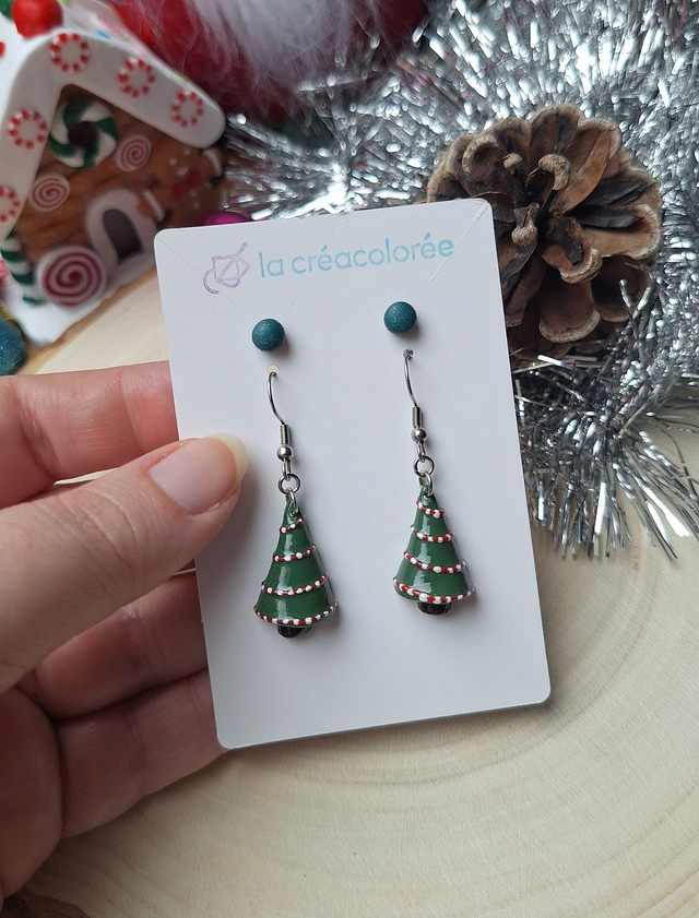 Chaque sapin est modelé à la main, puis décoré d’une guirlande rouge et blanche peinte minutieusement, avant d’être verni. Ce travail artisanal rend chaque paire unique et légèrement différente… comme un vrai sapin décoré avec soin.